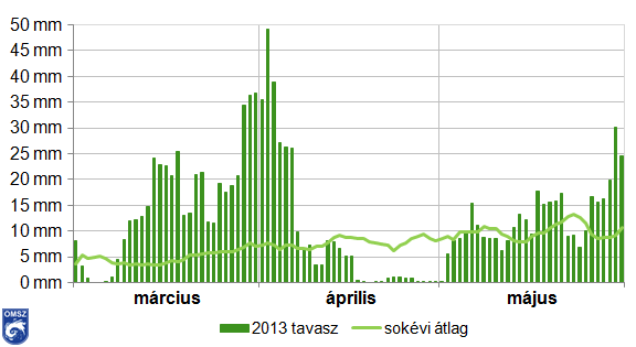 Az 1971-2000-es normálhoz viszonyítva átlag alatti és átlag feletti csapadékösszegek is jelentkeztek idén (7. ábra). Az előző térképhez hasonló, kelet-nyugati irányú növekvő értékeket láthatunk. A Dunántúlon jellemzően meghaladták az idei mennyiségek a sokéves átlagot, a nyugati határnál 1.5-szeres összegek is adódtak. Az Északi-középhegység, a Kiskunság, Pest megye és a keleti határszél területén azonban kicsivel elmaradtak az évszakos összegek a normáltól, 80-100%-os arány jellemezte ezeket az országrészeket.