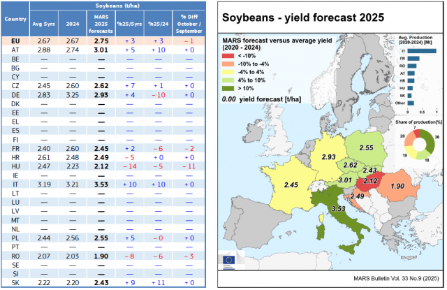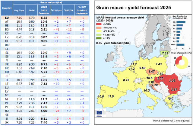 Északon a szeptemberi melegebb és szárazabb idő felgyorsította a kukorica szemtelítődését jó hozampotenciállal, míg délen és keleten továbbra is kritikus a helyzet, a nyári aszály hatásai nem mérséklődtek. Összességében a szemeskukorica és a szója hozam-előrejelzése változatlan, az ötéves átlag felett maradt.
