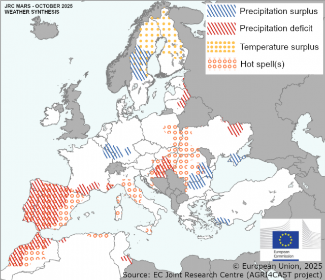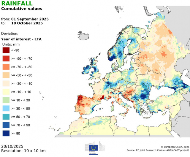 Keleten októberben hullott csapadék javította a talajnedvességet és kedvezett az őszi vetések megkezdésének, míg másutt a július óta tartó számottevő csapadékhiány nehezíti a vetési kampányt, ugyanakkor még elegendő idő van a fő őszi kalászosok optimális időablakon belüli elvetésére, és a következő napokra jelzett esők várhatóan javítanak a helyzeten.
