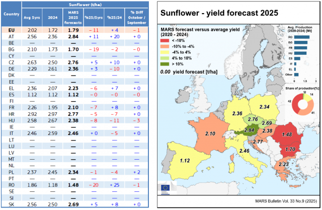 Napraforgó termésátlag előrejelzés a 2020-2024-es átlaghoz viszonyítva (forrás: ec.europa.eu/jrc/en/mars) (az oszlopok balról jobbra a következőket tartalmazzák: ország, 5 éves termésátlag (t/ha),