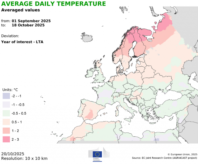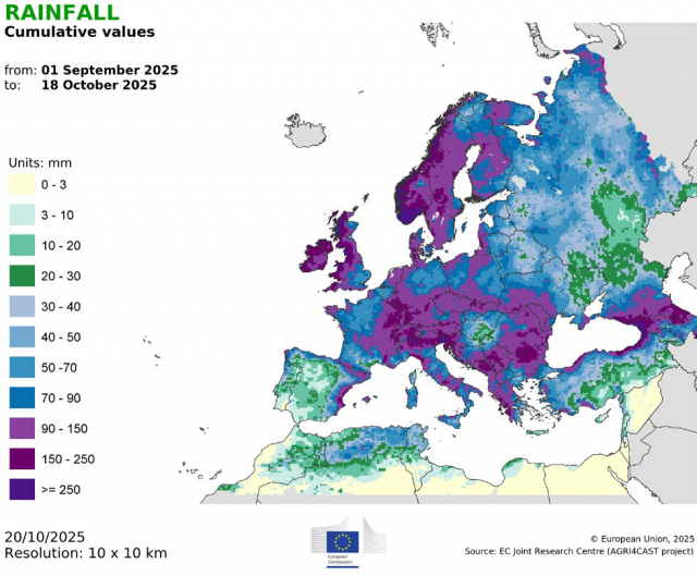 Európa jelentős részén, Franciaországtól Lengyelországig, illetve Skandináviától Olaszországig a kedvező időjárási és talaj viszonyok támogatták az időben végzett vetést, a jó kelést és a korai állományfejlődést. Ezzel szemben Bulgária és Románia egyes részein a túlzott nedvesség késleltette az őszi kalászosok vetését, míg Portugáliában, Spanyolországban, valamint Kelet-Horvátország és Magyarország bizonyos térségeiben a tartósan száraz talajok miatt csúszott az őszi gabonák és a repce elvetése. Utóbbi régiókban az egyöntetű keléshez mielőbb érkező csapadékra lesz szükség, amely várhatóan a következő hetekben meg is érkezik.