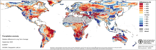2025. szeptember becsült csapadékösszegének eltérése a sokéves átlagtól (%) (forrás: www.fao.org)