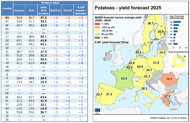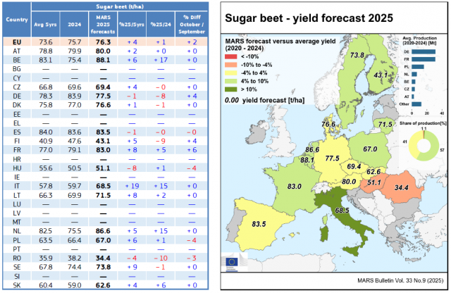 A cukorrépa és a burgonya betakarítása csak most indult, míg a szemeskukorica és a napraforgó ütemterv szerint halad, noha a nedves viszonyok helyenként késleltetik a munkát és ronthatják a minőséget. A terméskilátások továbbra is az ötéves átlag körül alakulnak. Az őszi káposztarepce vetése szeptember közepére lezárult; az őszi kalászosok vetése a kora szeptemberi sok csapadék miatt szeptember 20-ig lassabban haladt, azóta a szárazabb idő segíti a munkát, és a jelenlegi talajnedvesség kedvez a kelésnek és a korai fejlődésnek.