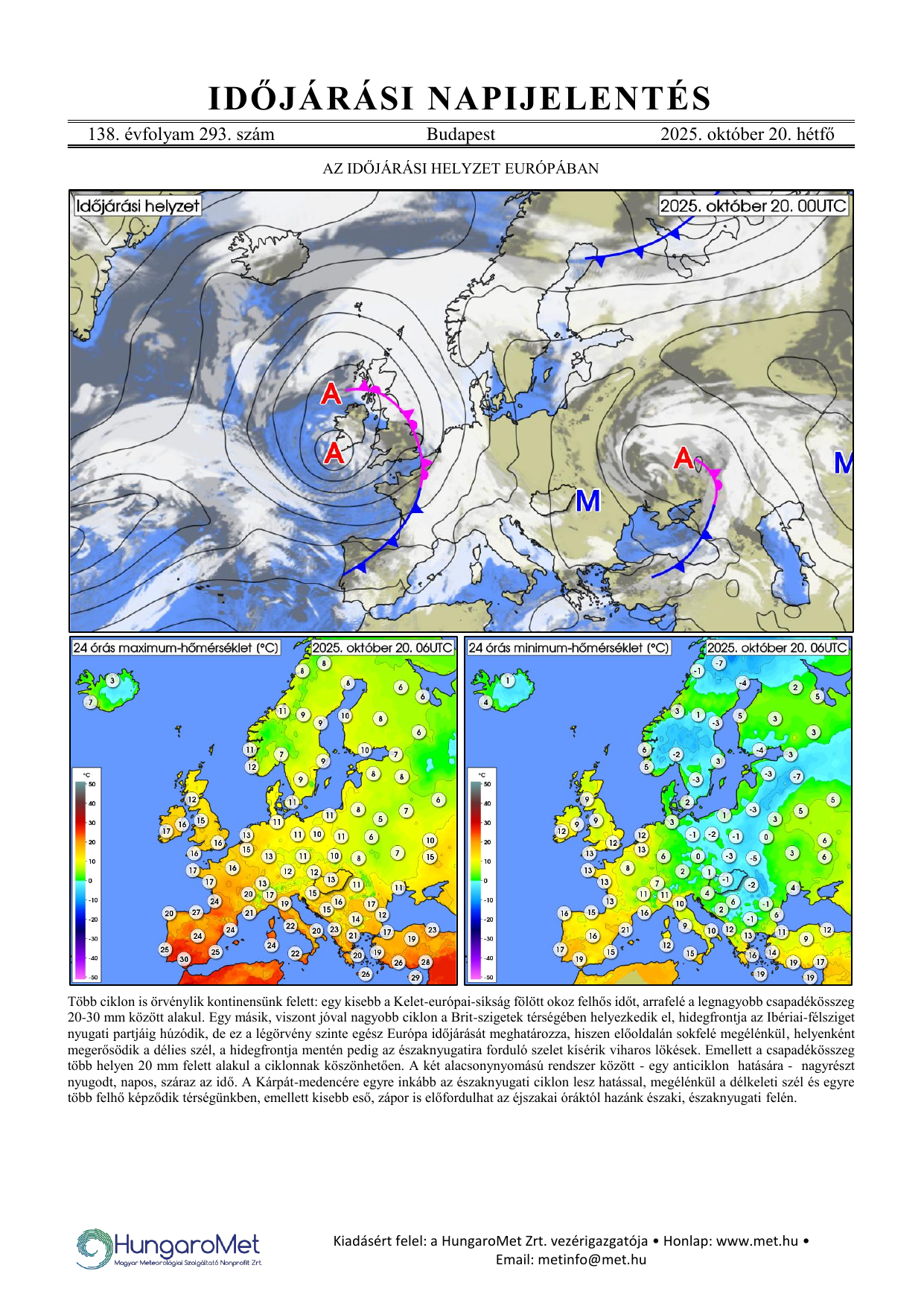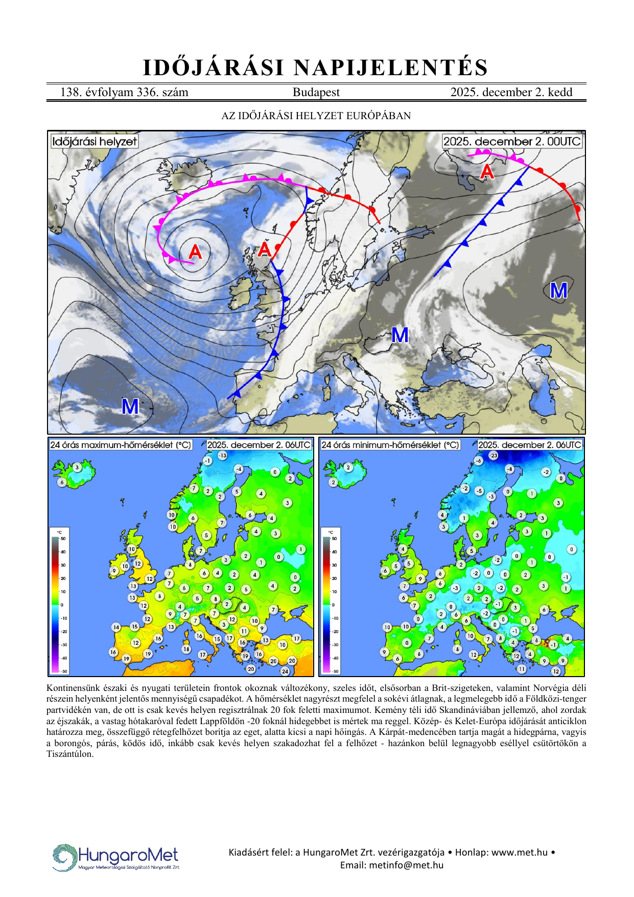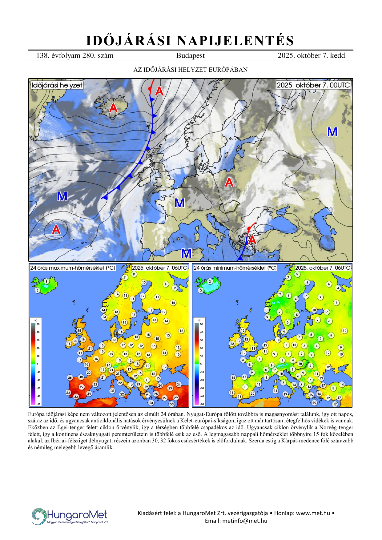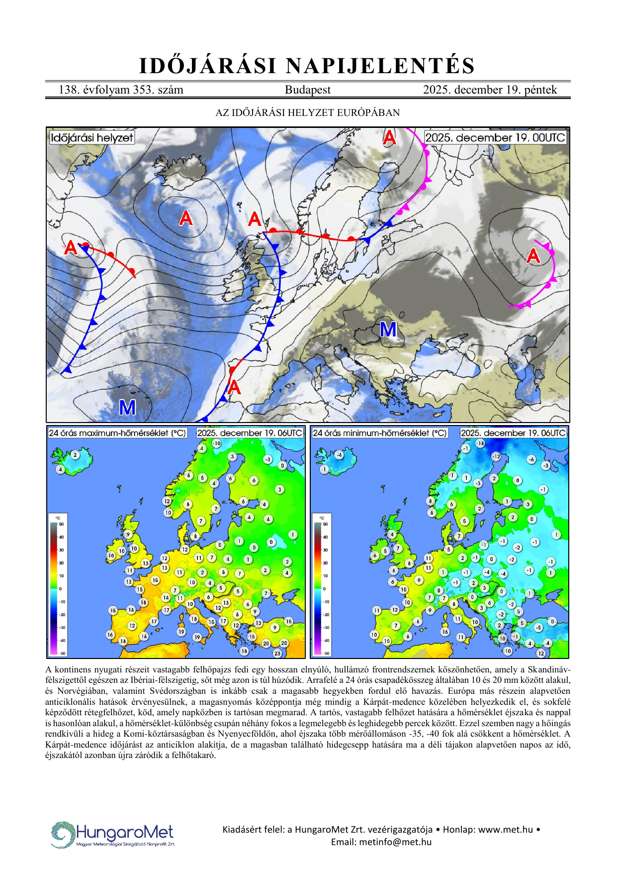 Az európai kitekintés a fronttérkép és a rövid szöveges elemzés mellett bővül a hőmérséklet napi minimum- és maximumértékeit ábrázoló térképekkel.