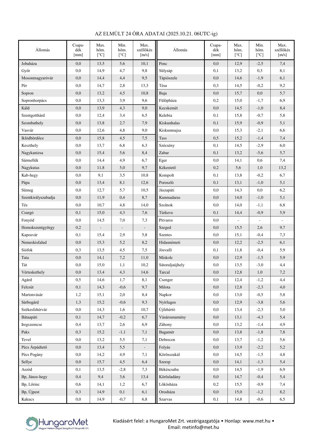A meteorológiai elemek OMSZ által mért napi értékei ezentúl kontúrtérképeken jelennek meg, de továbbra is tartalmaznak konkrét számértékeket, a korábbinál jóval több állomásról. A térképek alatt táblázatos formában feltüntetjük a napi szélsőértékeket és az abszolút napi rekordadatokat. Az eddigiektől eltérően a napi (24 órás) adatok egységesen, 06 és 06 UTC közötti időszakot fednek le – nagyobb összhangban a nemzetközi gyakorlattal.