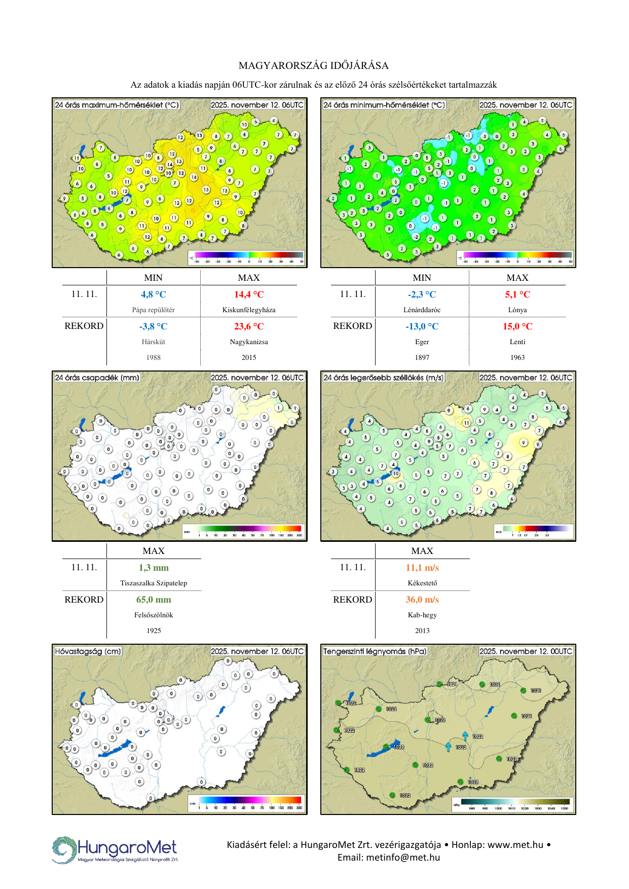 A meteorológiai elemek OMSZ által mért napi értékei ezentúl kontúrtérképeken jelennek meg, de továbbra is tartalmaznak konkrét számértékeket, a korábbinál jóval több állomásról. A térképek alatt táblázatos formában feltüntetjük a napi szélsőértékeket és az abszolút napi rekordadatokat. Az eddigiektől eltérően a napi (24 órás) adatok egységesen, 06 és 06 UTC közötti időszakot fednek le – nagyobb összhangban a nemzetközi gyakorlattal.