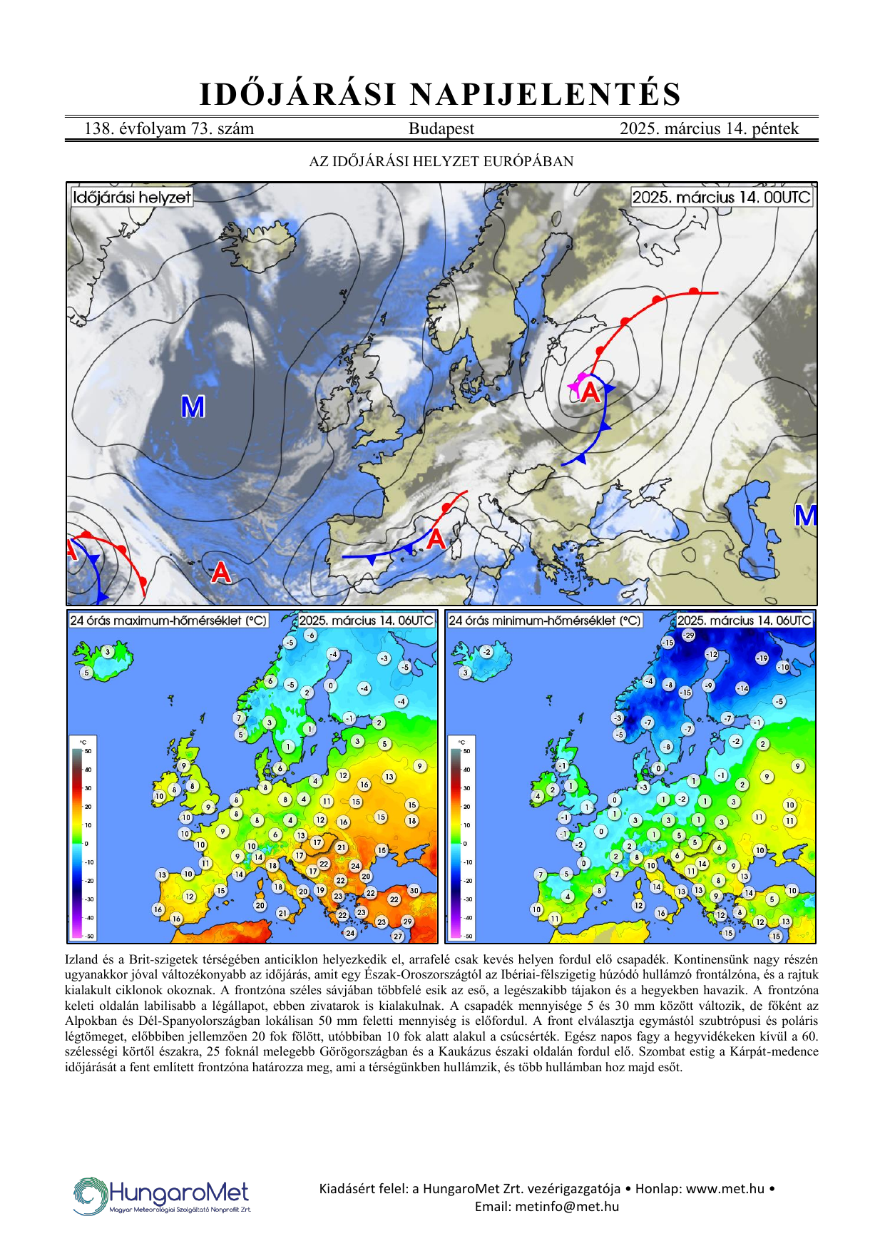Az európai kitekintés a fronttérkép és a rövid szöveges elemzés mellett bővül a hőmérséklet napi minimum- és maximumértékeit ábrázoló térképekkel.