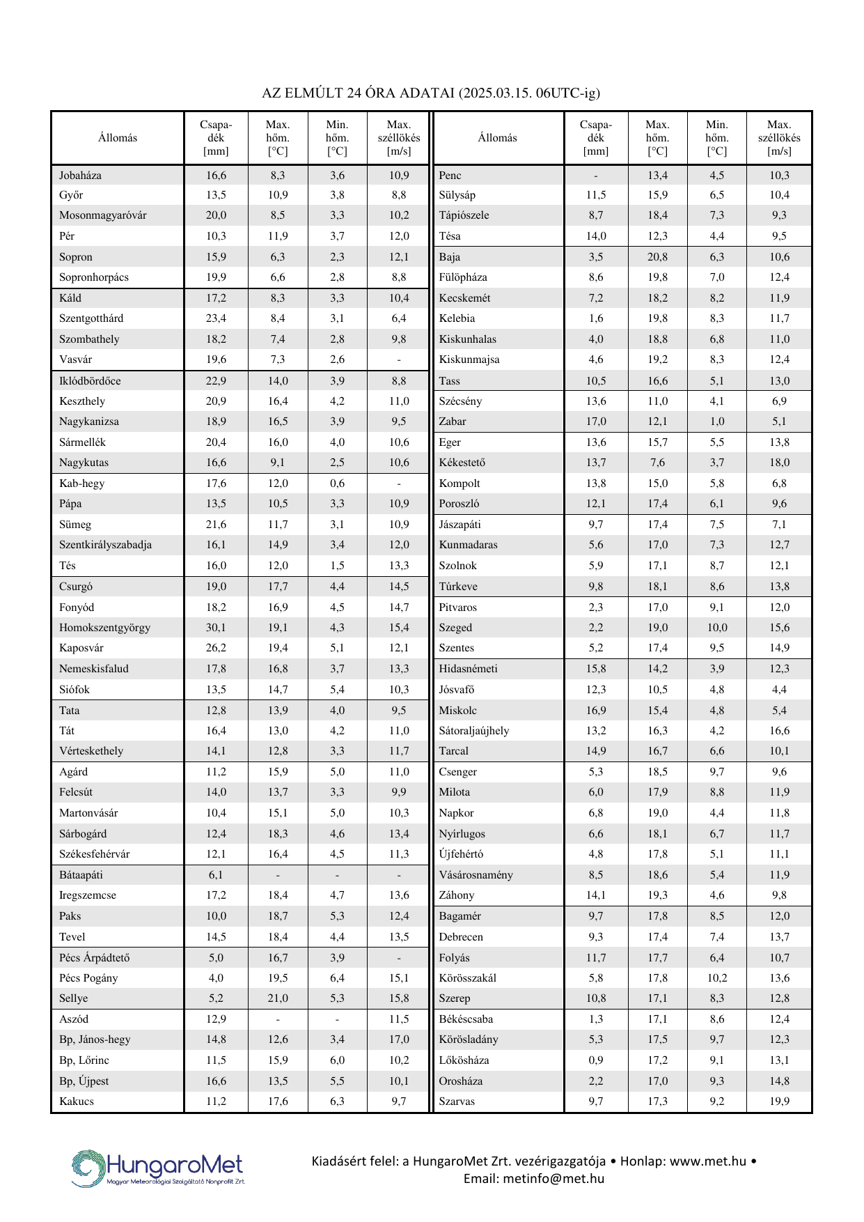 - az OMSZ mérőhálózatán mért meteorológiai adatok napi összegzésével,