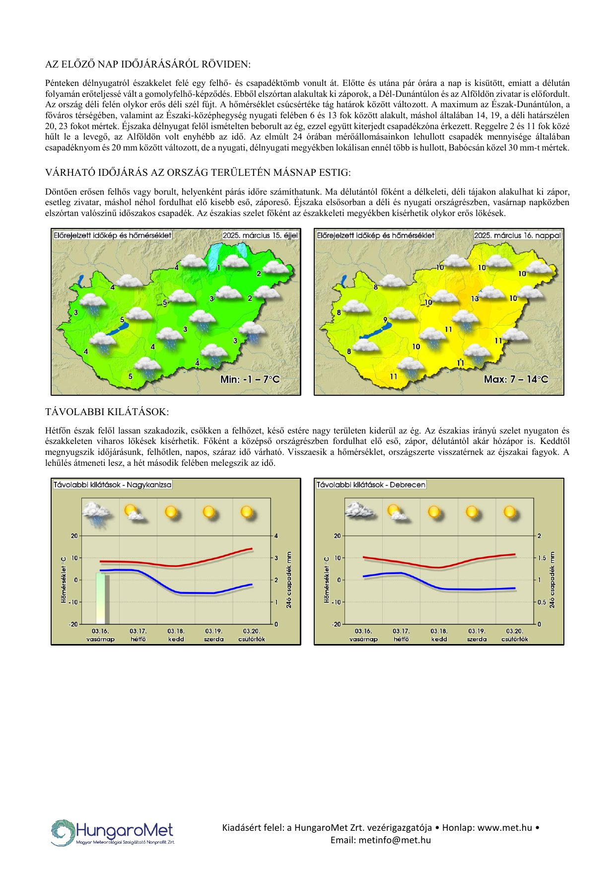 A meteorológiai elemek OMSZ által mért napi értékei ezentúl kontúrtérképeken jelennek meg, de továbbra is tartalmaznak konkrét számértékeket, a korábbinál jóval több állomásról. A térképek alatt táblázatos formában feltüntetjük a napi szélsőértékeket és az abszolút napi rekordadatokat. Az eddigiektől eltérően a napi (24 órás) adatok egységesen, 06 és 06 UTC közötti időszakot fednek le – nagyobb összhangban a nemzetközi gyakorlattal.