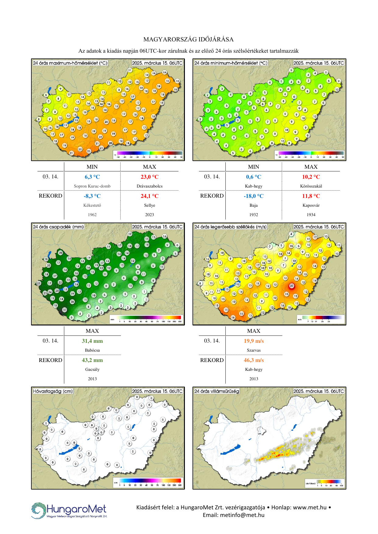 A meteorológiai elemek OMSZ által mért napi értékei ezentúl kontúrtérképeken jelennek meg, de továbbra is tartalmaznak konkrét számértékeket, a korábbinál jóval több állomásról. A térképek alatt táblázatos formában feltüntetjük a napi szélsőértékeket és az abszolút napi rekordadatokat. Az eddigiektől eltérően a napi (24 órás) adatok egységesen, 06 és 06 UTC közötti időszakot fednek le – nagyobb összhangban a nemzetközi gyakorlattal.