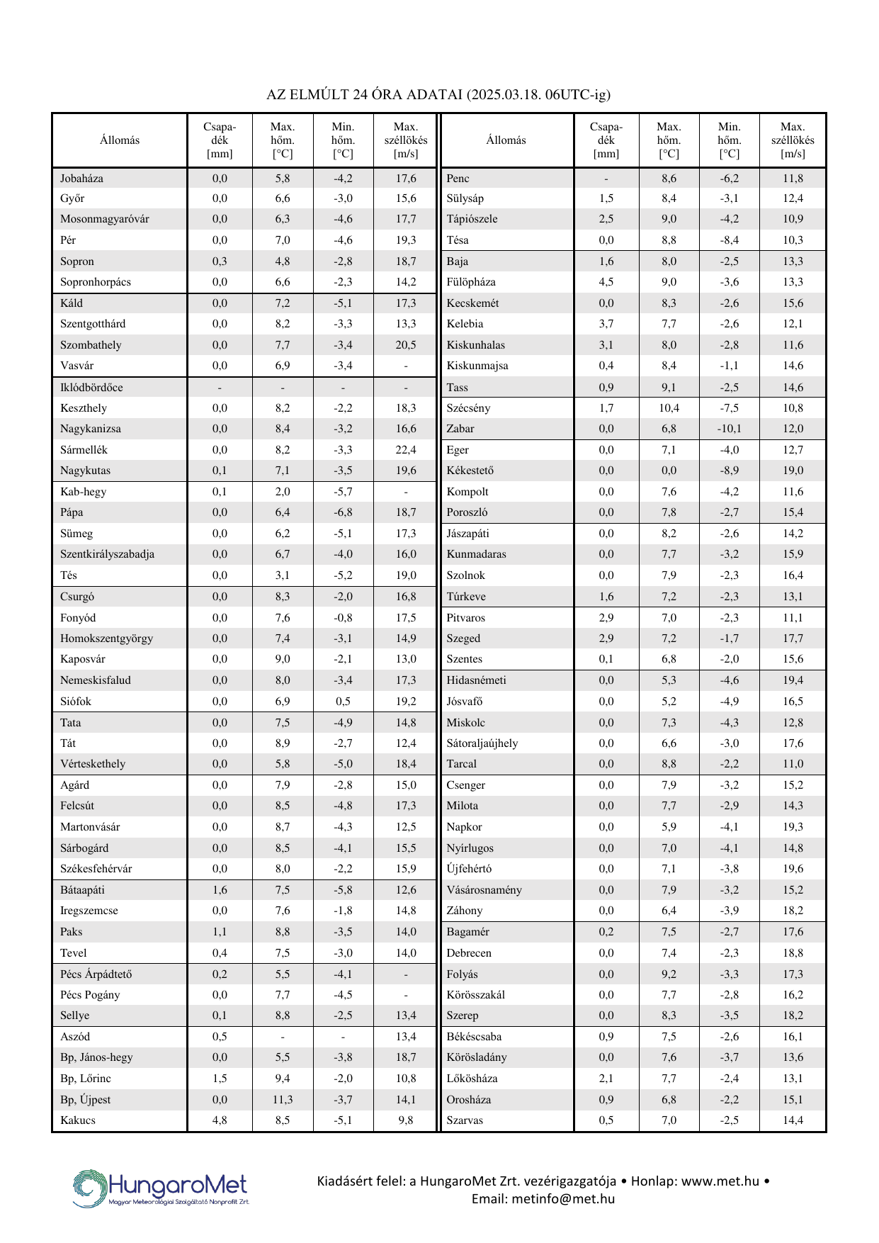 A meteorológiai elemek OMSZ által mért napi értékei ezentúl kontúrtérképeken jelennek meg, de továbbra is tartalmaznak konkrét számértékeket, a korábbinál jóval több állomásról. A térképek alatt táblázatos formában feltüntetjük a napi szélsőértékeket és az abszolút napi rekordadatokat. Az eddigiektől eltérően a napi (24 órás) adatok egységesen, 06 és 06 UTC közötti időszakot fednek le – nagyobb összhangban a nemzetközi gyakorlattal.