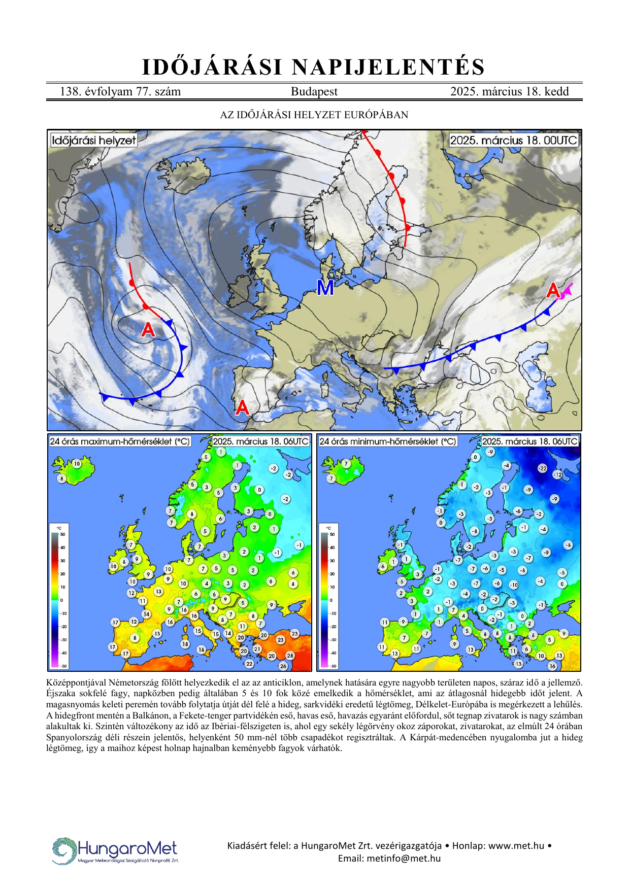Az európai kitekintés a fronttérkép és a rövid szöveges elemzés mellett bővül a hőmérséklet napi minimum- és maximumértékeit ábrázoló térképekkel.