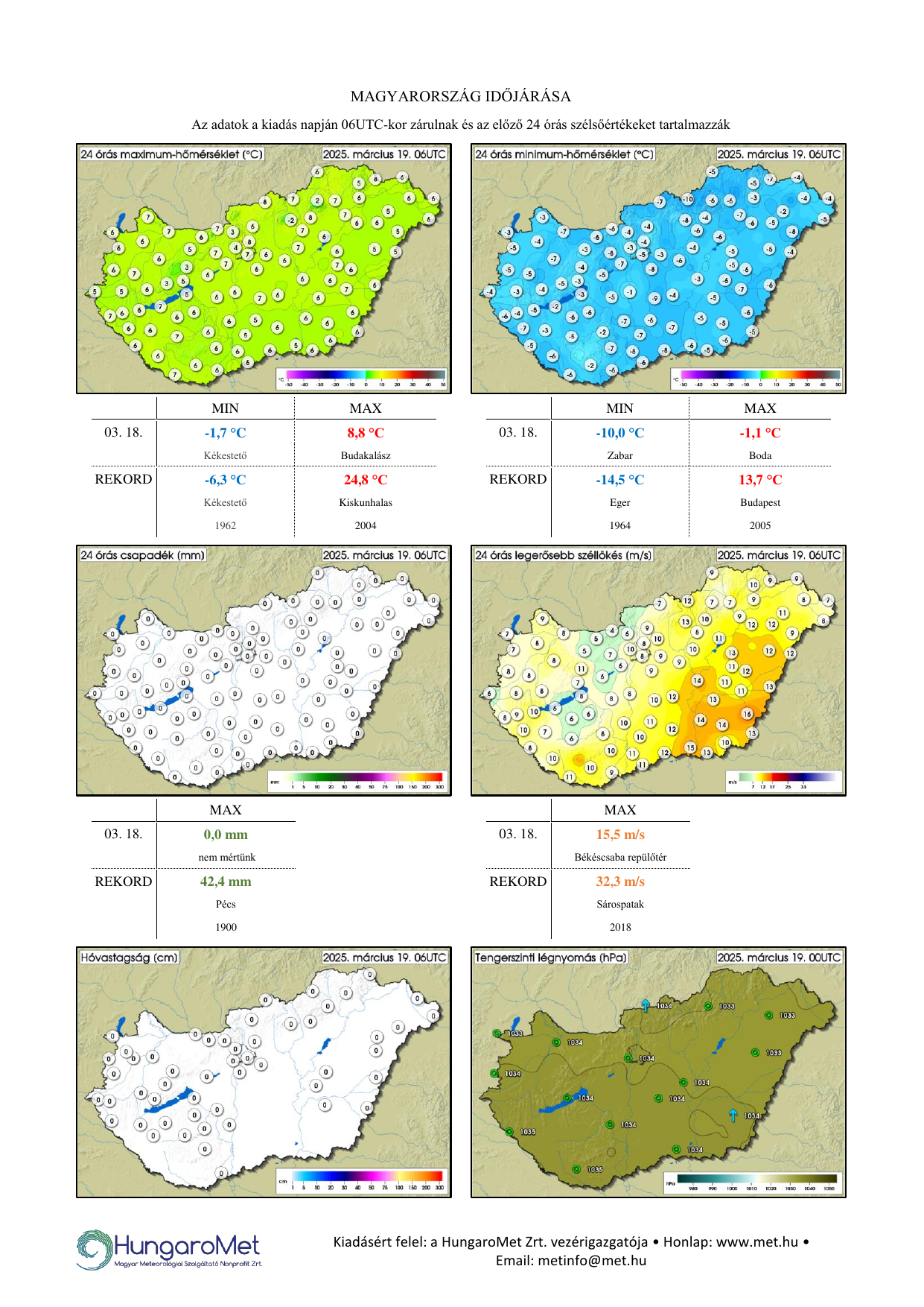 A meteorológiai elemek OMSZ által mért napi értékei ezentúl kontúrtérképeken jelennek meg, de továbbra is tartalmaznak konkrét számértékeket, a korábbinál jóval több állomásról. A térképek alatt táblázatos formában feltüntetjük a napi szélsőértékeket és az abszolút napi rekordadatokat. Az eddigiektől eltérően a napi (24 órás) adatok egységesen, 06 és 06 UTC közötti időszakot fednek le – nagyobb összhangban a nemzetközi gyakorlattal.