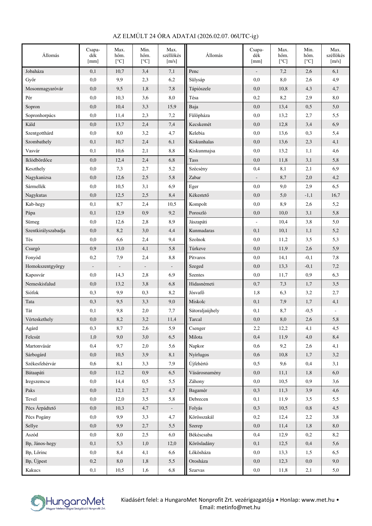 A meteorológiai elemek Hungaromet Zrt. által mért napi értékei ezentúl kontúrtérképeken jelennek meg, de továbbra is tartalmaznak konkrét számértékeket, a korábbinál jóval több állomásról. A térképek alatt táblázatos formában feltüntetjük a napi szélsőértékeket és az abszolút napi rekordadatokat. Az eddigiektől eltérően a napi (24 órás) adatok egységesen, 06 és 06 UTC közötti időszakot fednek le – nagyobb összhangban a nemzetközi gyakorlattal. Az abszolút napi rekordok időszakának tekintetében a hazai évtizedes gyakorlat a következő (rekord napja = aznap):