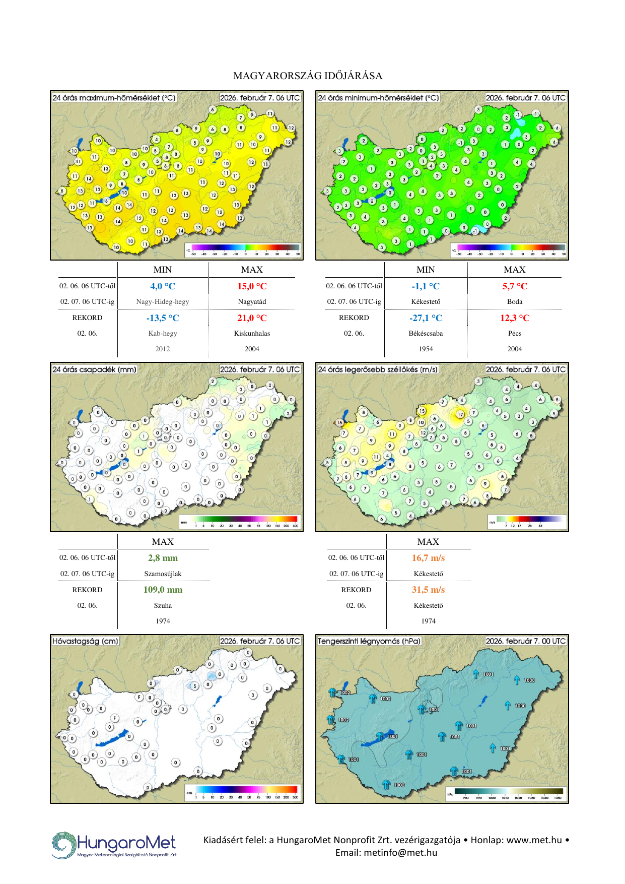A meteorológiai elemek Hungaromet Zrt. által mért napi értékei ezentúl kontúrtérképeken jelennek meg, de továbbra is tartalmaznak konkrét számértékeket, a korábbinál jóval több állomásról. A térképek alatt táblázatos formában feltüntetjük a napi szélsőértékeket és az abszolút napi rekordadatokat. Az eddigiektől eltérően a napi (24 órás) adatok egységesen, 06 és 06 UTC közötti időszakot fednek le – nagyobb összhangban a nemzetközi gyakorlattal. Az abszolút napi rekordok időszakának tekintetében a hazai évtizedes gyakorlat a következő (rekord napja = aznap):